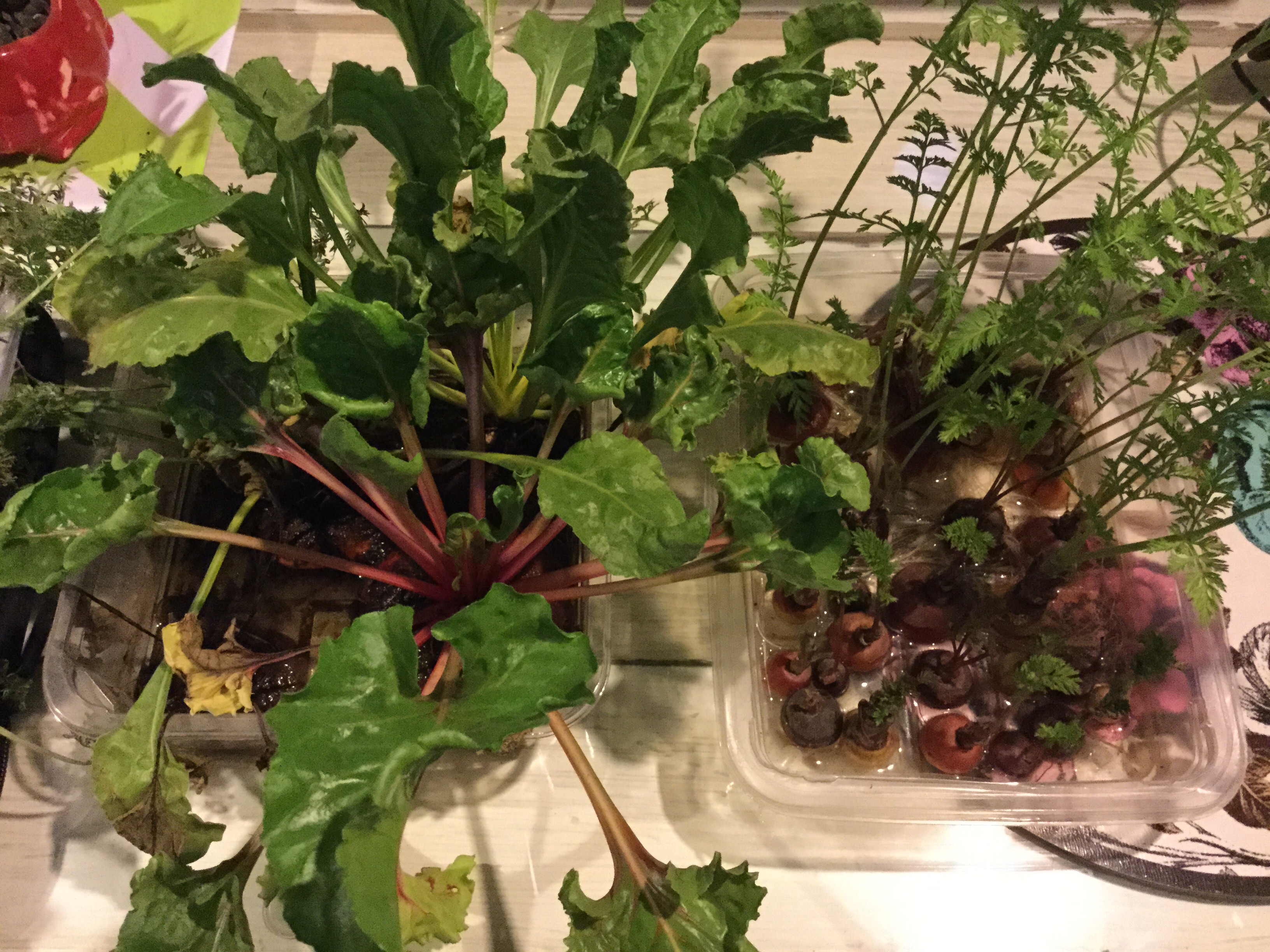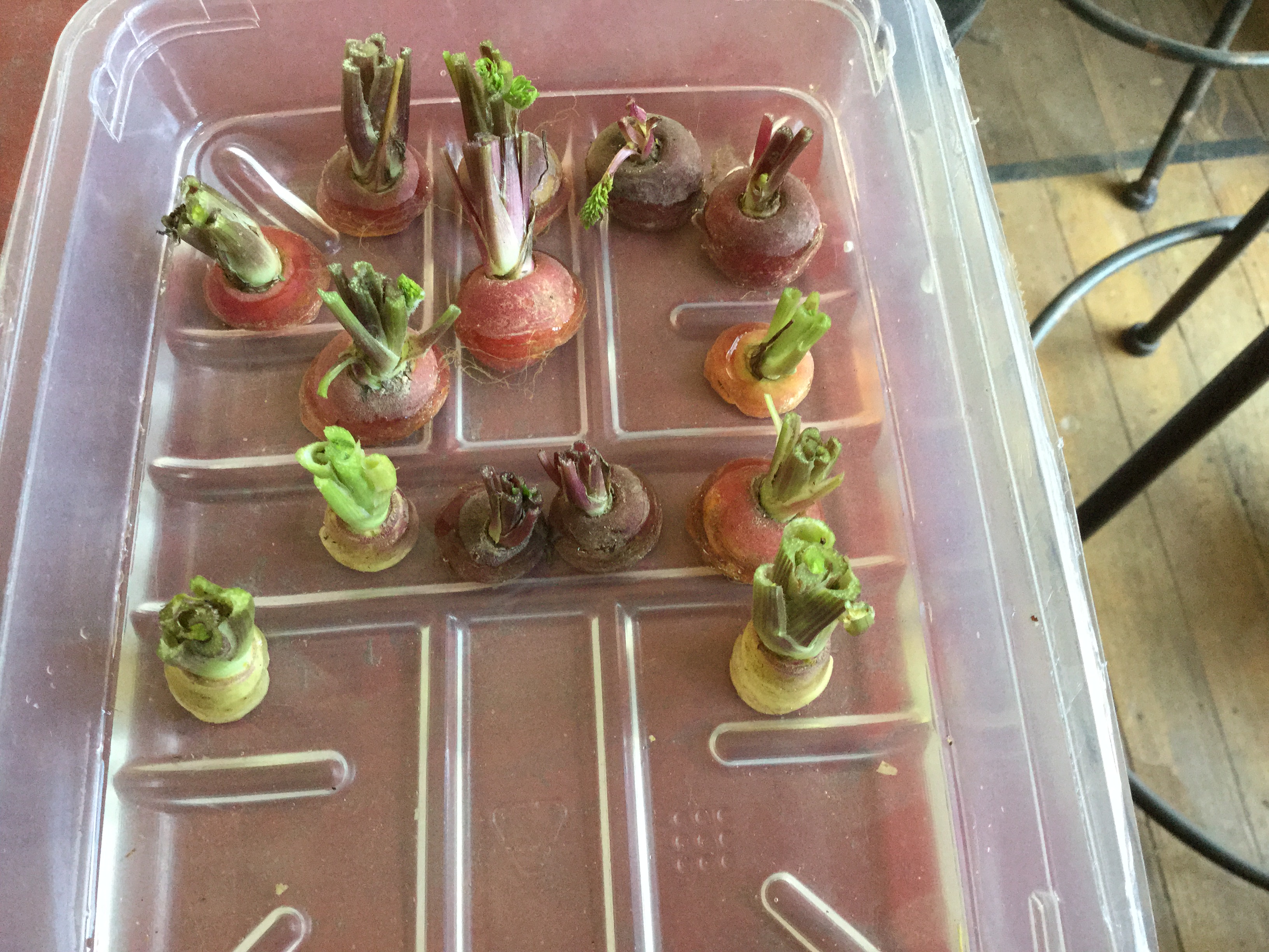 In these three trays (recycled meat trays from the supermarket) pour 5mm water in and add carrot off cuts, beetroot, celery, pal choy etc etc and grow not for root re growth but seed! Harvest then plant out your own seed from multi coloured carrot, chard and the list goes on…