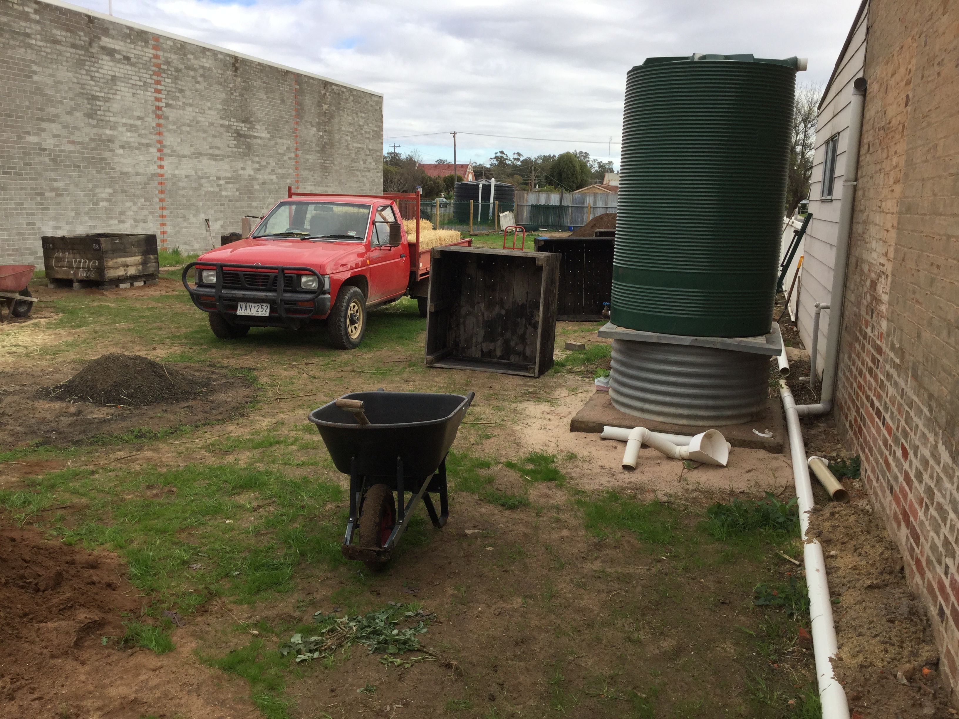 The MG ute ready to off load the next straw bales for another raised bed at the entrance. Second one shows the fruit transportation crates bought ready to have geotec stapled in over the drainage holes. The tank was donated and has been plumbed into the shop next door letting the Warracknabeal CG use that water. From the back of the plot in pix 3 and 4 look toward the main street showing the donated pool fencing erected by Mr. Inkster, a local farmer and quiet achiever.