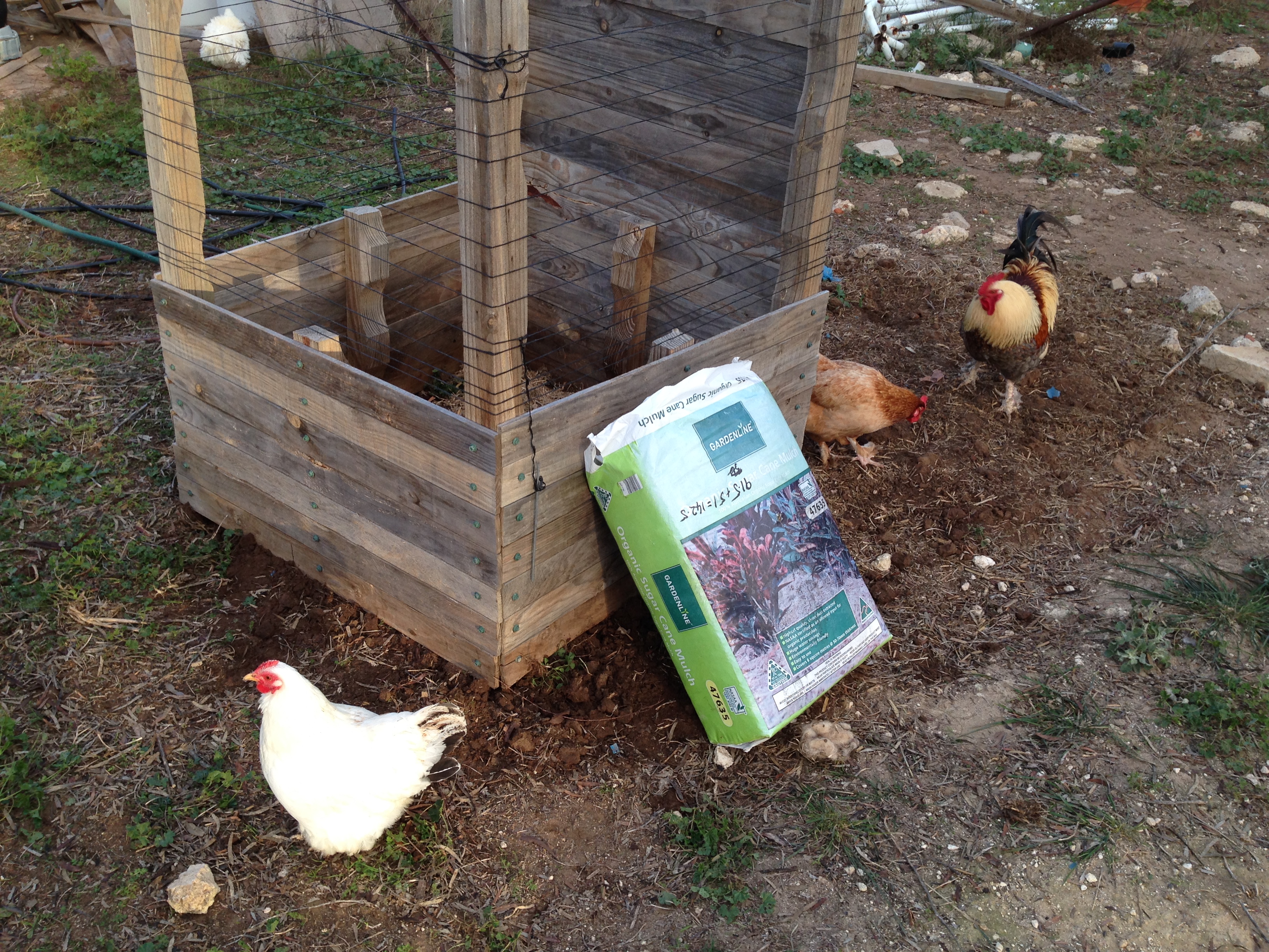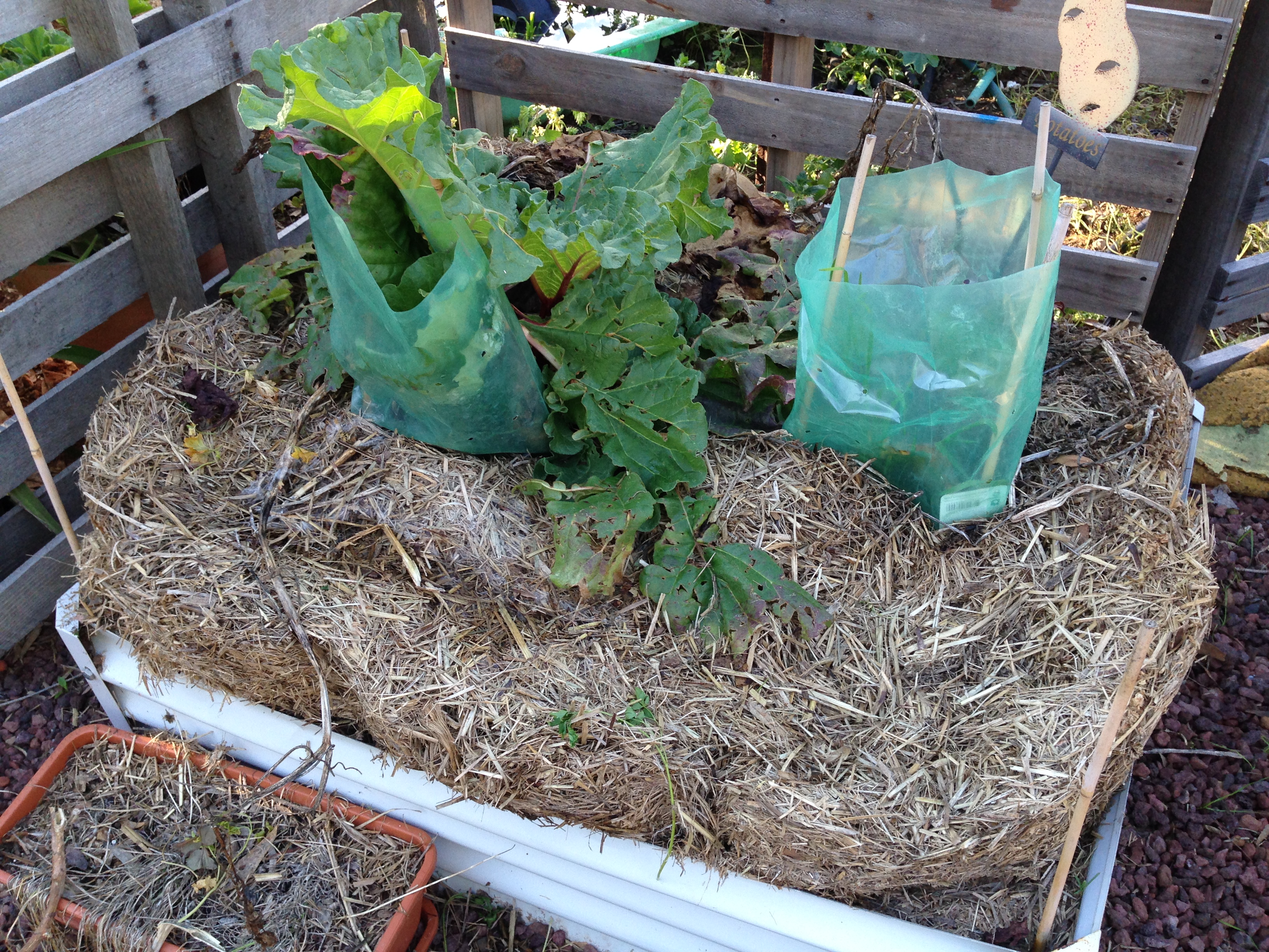 Keep the water up and chooks out (bailing twine wrapped around the frame). As the spuds emerge thru the mulch cover to the top leaving a tip showing. If the box gets filled I can add more boards to increase the mulch height.