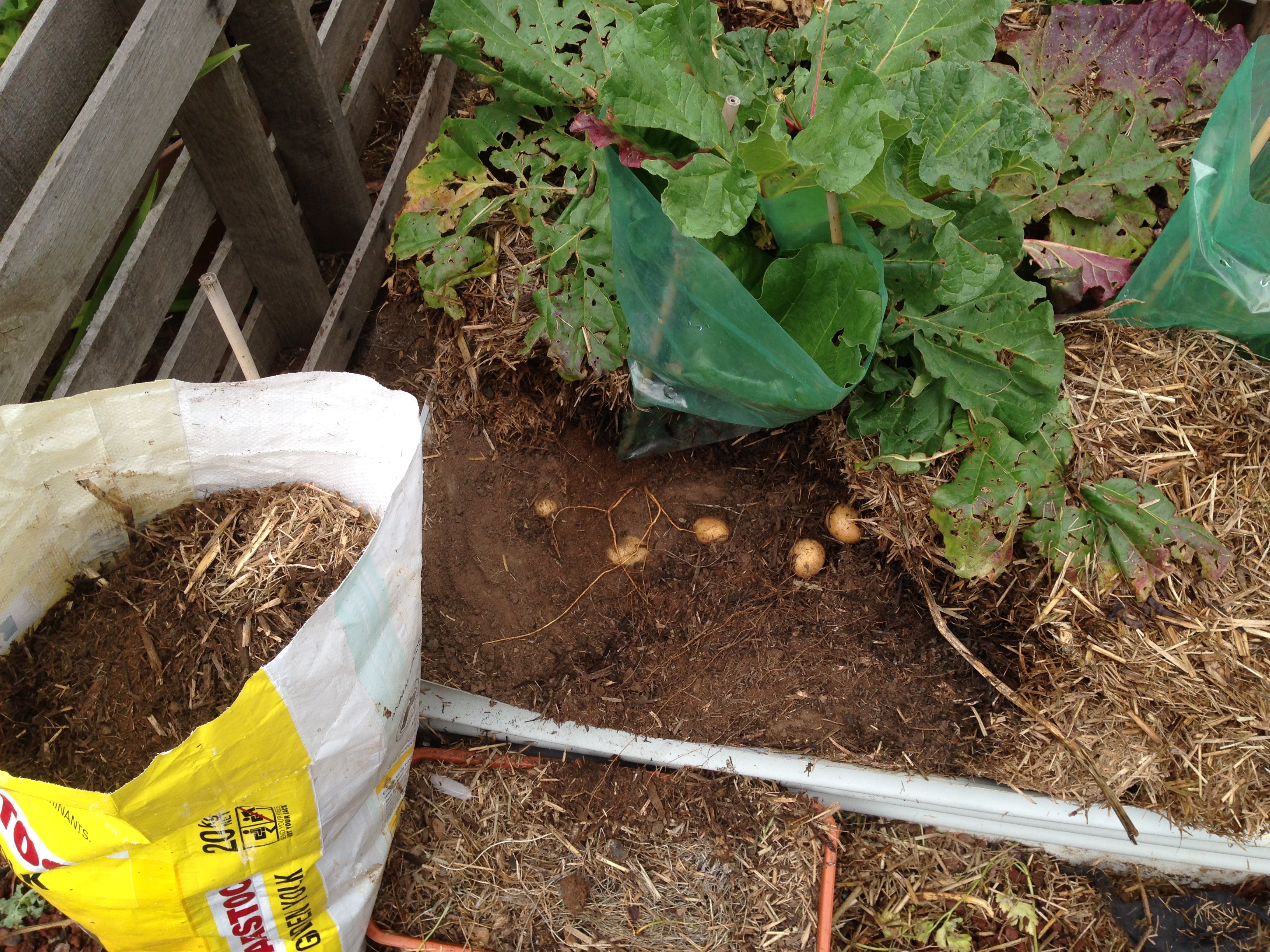 The bed was surrounded by tree guards to keep the mulch in the bed so chooks couldn’t scratch it out. Middle pic shows the mulch being lifted and bagged with new spuds being removed as we go. They fell out of the mulch onto the raised bed and collected. The last pic shows the result. From 6 seed spuds weighing around 250 grams to a basket and pail weighing in total 9 kg! Granted there were some very small ones left in the bed as I didn’t want to disturb the rhubarb too much, Ah well, spuds as weeds is a good thing…