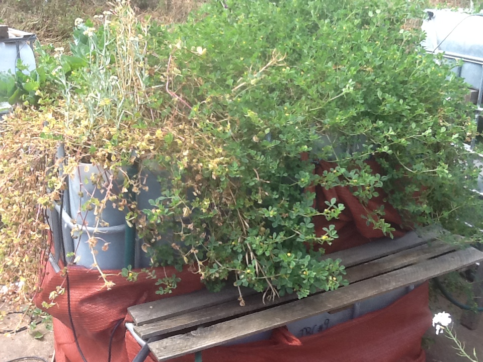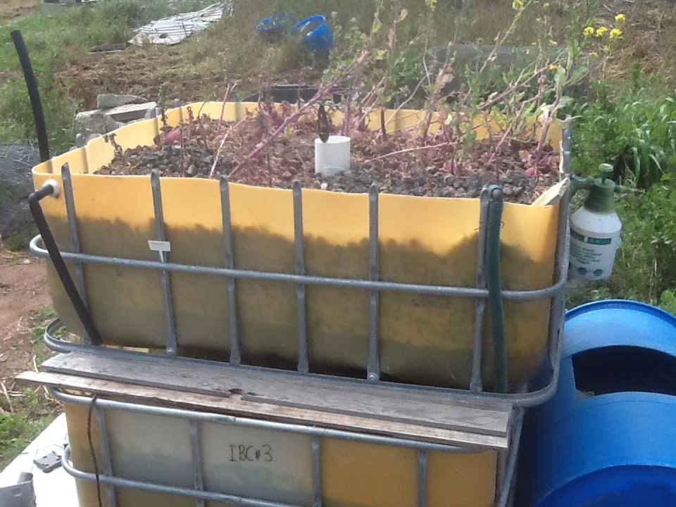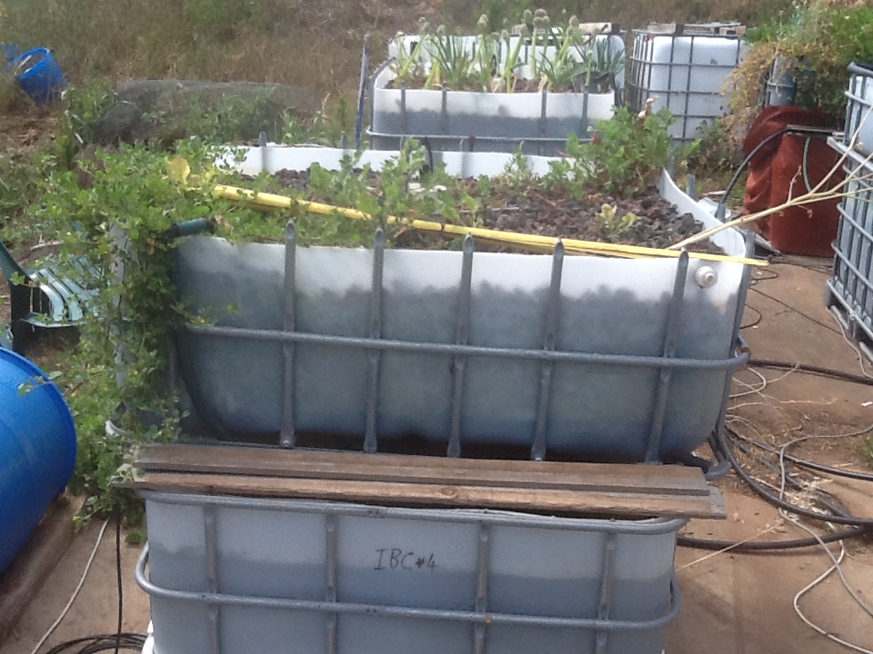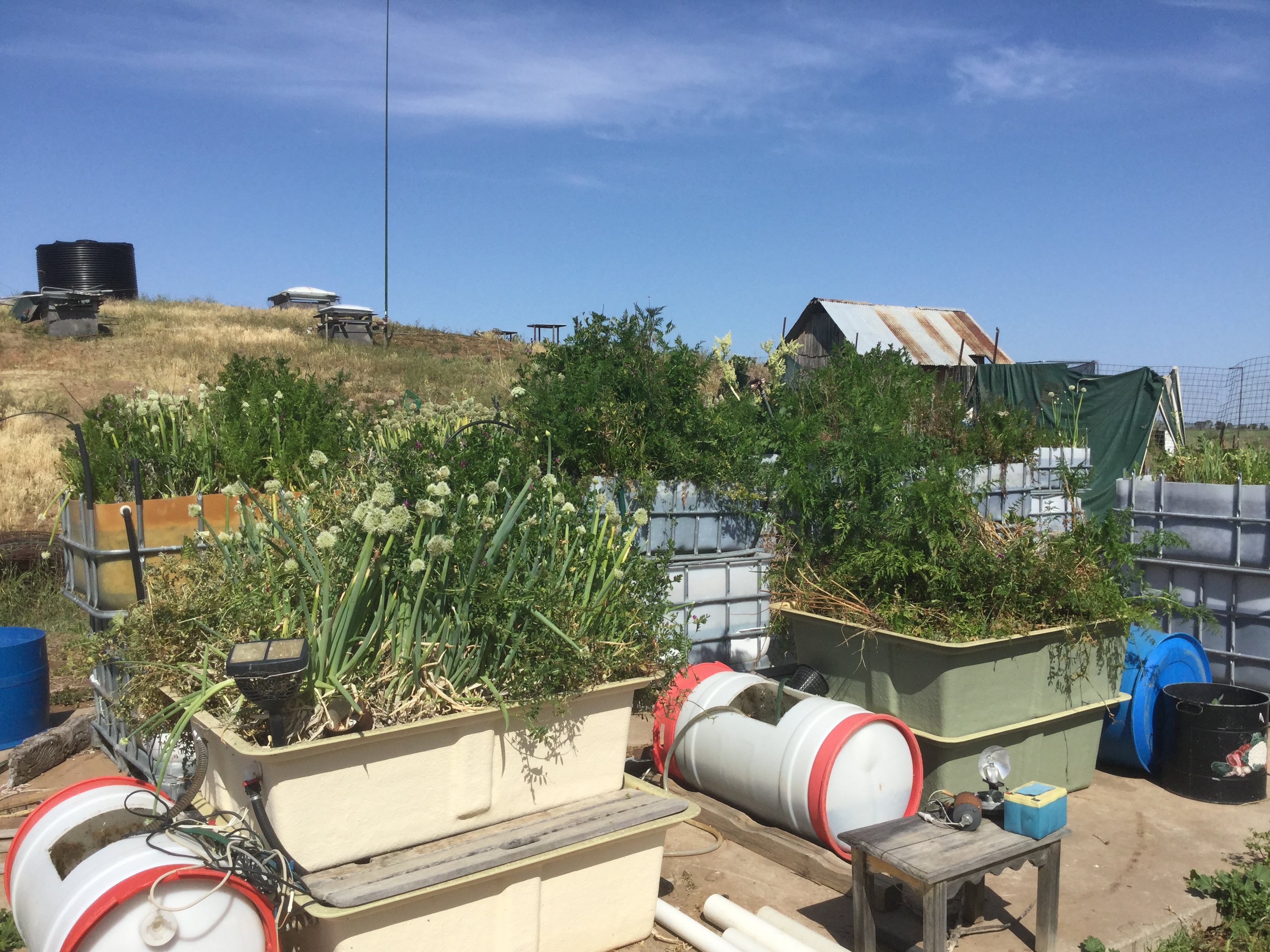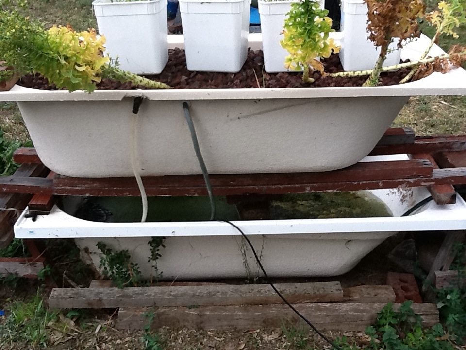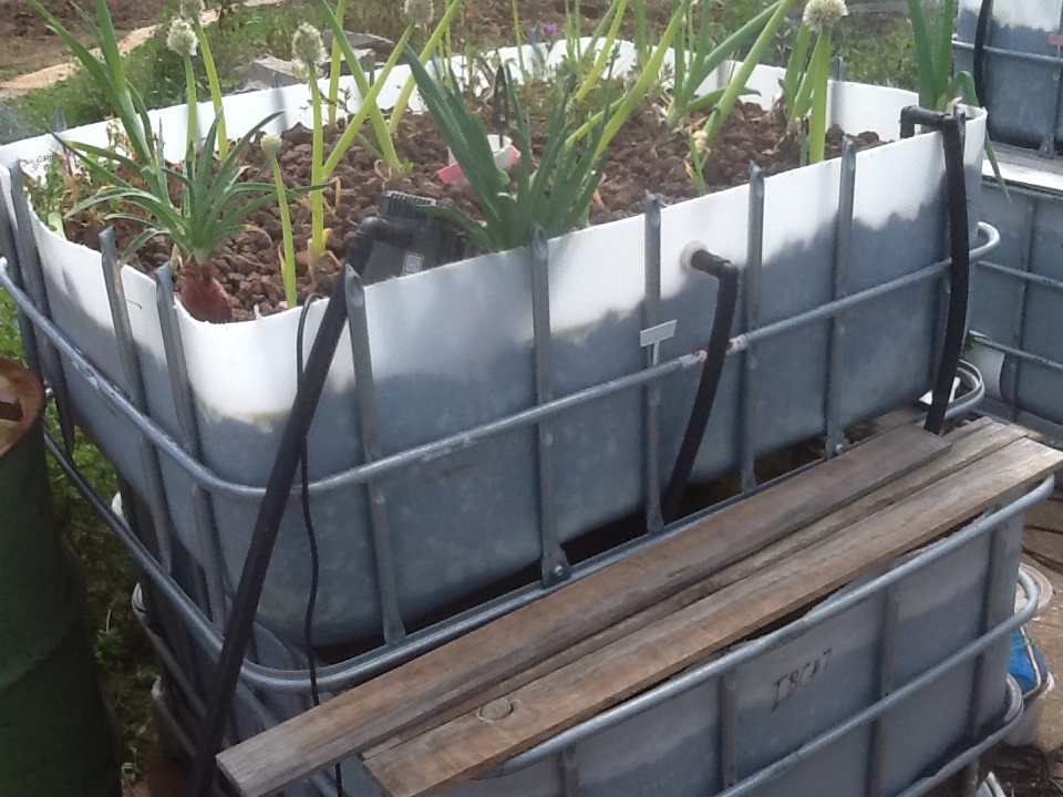 Shot from the top of the terradome, 14 beds with two IBC’s acting as water levelers which is where any new water gets added. All the beds float off each other so if there is a build up of ammonia/nitrite/nitrate it is spread over all the beds. I have not had a fish death related to lack of DO (Dissolved Oxygen) or overheated water in summer in the past two years. To the right of the cement slab under 20 cm of dirt is a coil of black 19 mm poly pipe which acts as a constant thermal mass, cooling the water in summer to 18 to 25 deg C and keeping it warm in winter at around 20 deg C. Very simple system using mostly recycled fittings found around the farm and from various tips and clearing sales.