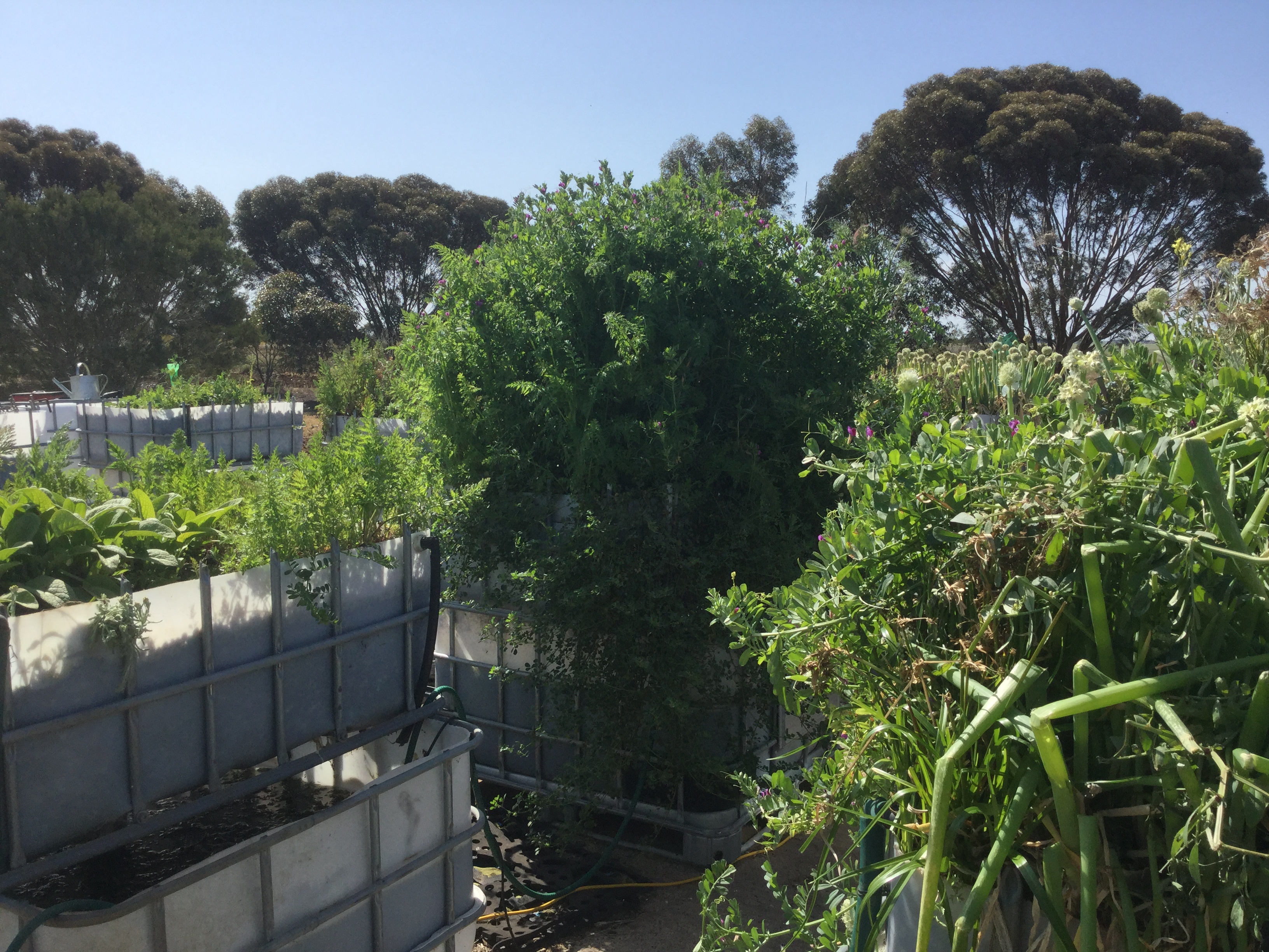 L to r is vetch and onion, vetch and carrot, onions, rhubarb rainbow chard (flowering) and strawberries, vetch and carrot again. In front is spare space taken up with cuttings and trees in tubes for the bush food plantings. Why so much vetch I hear you ask? Chooks of course! Makes for bright yellow yolks and very healthy chicks. There will be a separate page on our poultry endeavors later…